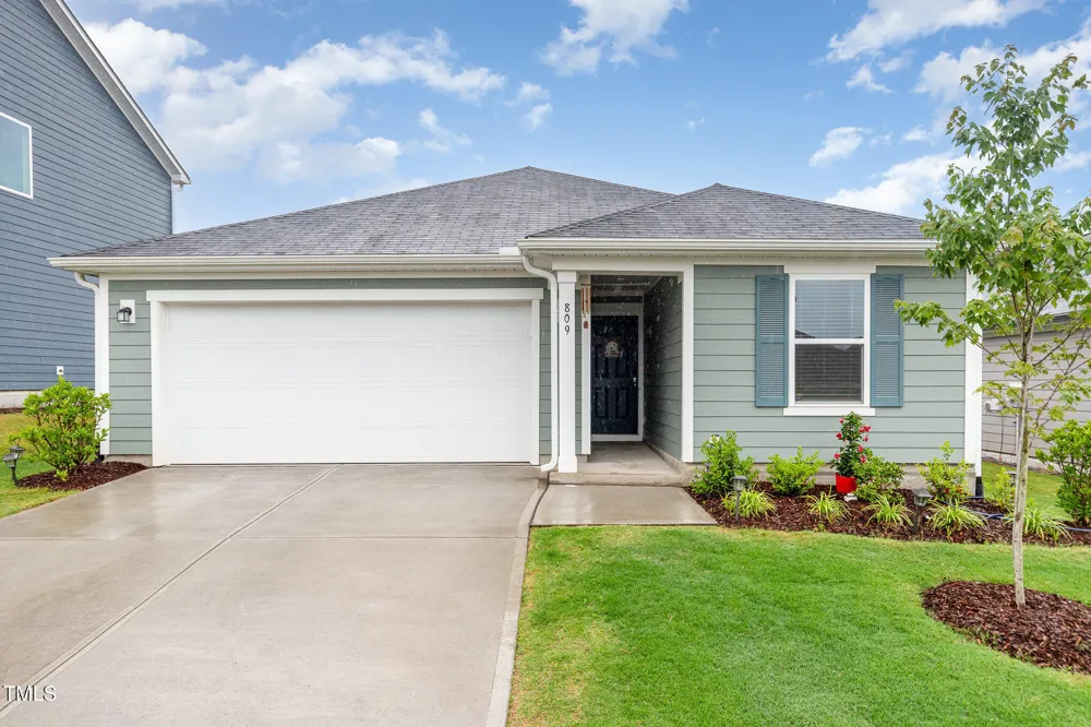 Welcome to 809 Doggard Lane - ONE LEVEL detached home nestled in desirable Olive Grove! This 2024 single-family residence offers the perfect blend of modern design, energy efficiency, and everyday functionality—all set on a 0.14-acre homesite with thoughtful landscaping, fenced back yard, and cozy patio. Spanning 1,891 square feet, this beautifully designed home features 3 spacious bedrooms and 2 full bathrooms. The open-concept layout seamlessly connects the kitchen, dining, and living areas. Recent upgrades include custom window treatments, painted garage interior with epoxy floor, modern lighting, ceiling fans, and home security system. Located just minutes from major highways, shopping, parks, Brier Creek and vibrant downtown Durham, this home offers the ideal mix of suburban tranquility and city convenience. Whether you're looking to upsize, downsize, or find your forever home, 809 Doggard Lane is move-in ready and waiting for you. Don't miss this opportunity to live in one of Durham's most sought-after new communities!